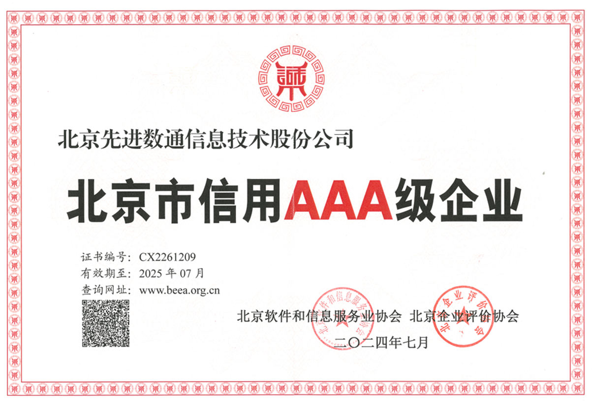 近期,凯发K8再次获评“北京市信用AAA级企业”认证。该认证由北京软件和信息服务业协会、北京企业评价协会共同评定颁发,遵循“自愿、客观、公正、公开”原则,经企业自愿申报、第三方信用评价、所在行业协会集中审核等工作程序,是北京市企业信用评级中的最高级别。